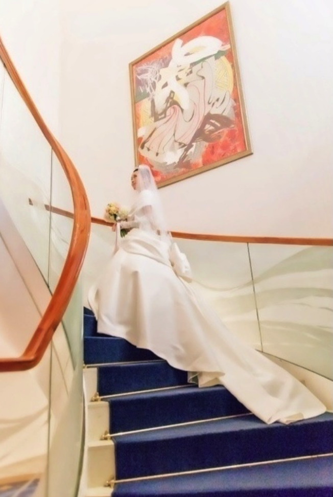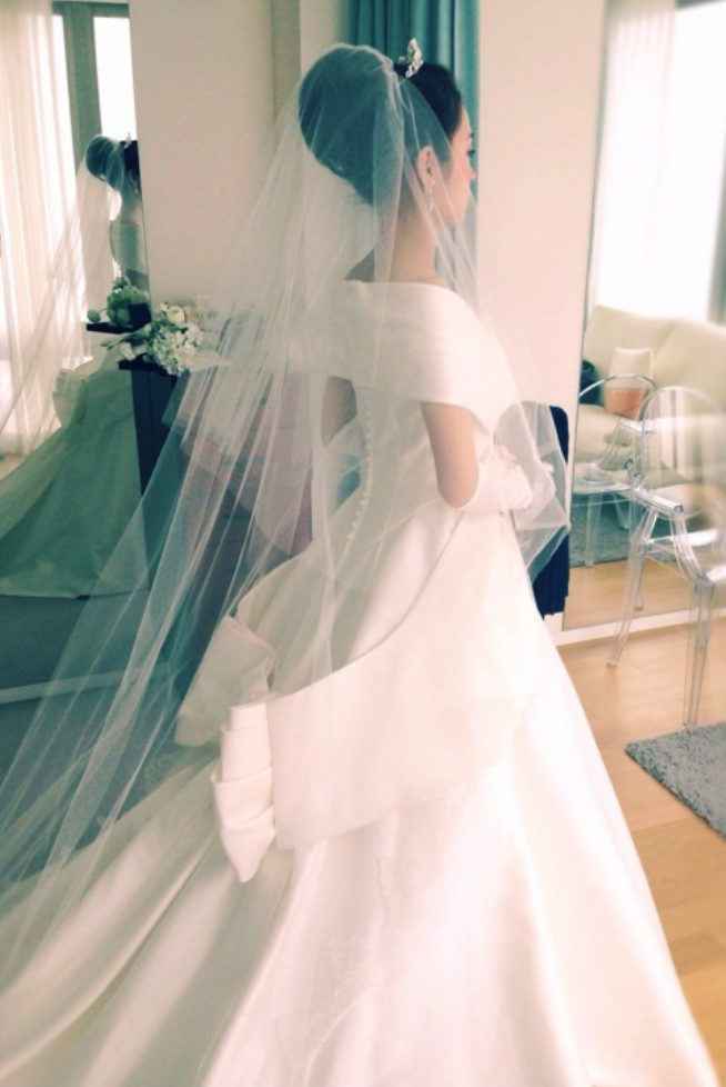 初めて袖を通した時に、今までのドレスとはまったく違う生地のハリと、体を美しく魅せてくれる魔法に感動し、そして何より、着ていると幸せが溢れてきました