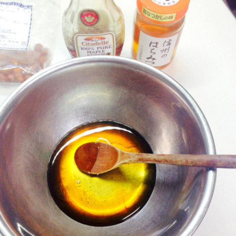 A オイルと、ハチミツと、メープルシロップをボールに入れて混ぜます