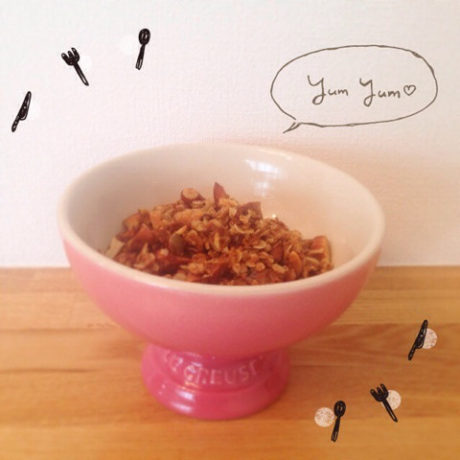 今までは購入したグラノーラに、温めたハチミツとココナッツオイルをかけて幸せを感じていたけれど、この手作りグラノーラは最初から幸せを感じるお味なので、このままミルクをかけて頂いています