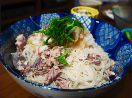みやちゃんおススメのサヴァ缶(オリーブオイルでつけてあるの!)とそうめんの組み合わせ!
